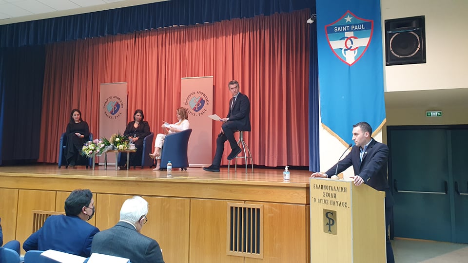 Η εκδήλωση ξεκίνησε με χαιρετισμό του οικοδεσπότη της Σχολής, του κ. Μάνθου Ρούσσου, αναπλ. Γενικού διευθυντή της Σχολής και με χαιρετισμό – τοποθέτηση του προέδρου του Συλλόγου Αποφοίτων, κ. Πέτρου Ιωσηφίδη.