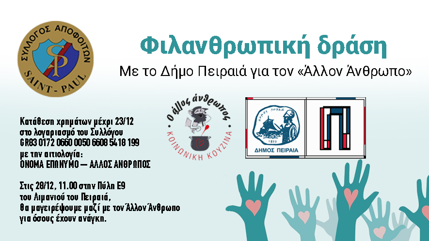 Παράλληλα, όσοι επιθυμούν να συμμετέχουν στην προετοιμασία και το σερβίρισμα, την Πέμπτη 28 Δεκεμβρίου, παρακαλούνται όπως στείλουν τα στοιχεία τους (Ονοματεπώνυμο) είτε στο προφίλ του Συλλόγου στο Facebook είτε μέσω email στο info@saintpaul-amicale.gr