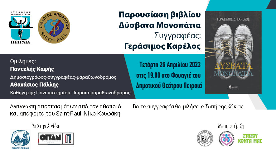 Ο Σύλλογος Δρομέων Υγείας Πειραιά σε συνεργασία με το Σύλλογο Αποφοίτων της Ελληνογαλλικής Σχολής Saint-Paul, με τη στήριξη της Εταιρείας Γραμμάτων και Τεχνών Πειραιά και του Ομίλου Στάσου Κοντά μας, παρουσιάζουν το νέο βιβλίο του μέλους του ΣΔΥΠ Μαραθωνοδρόμου Γεράσιμου Καρέλου με τίτλο «Δύσβατα Μονοπάτια», την Τετάρτη 26 Απριλίου 2023 στις 19.00 στο Φουαγιέ του Δημοτικού Θεάτρου Πειραιά.
