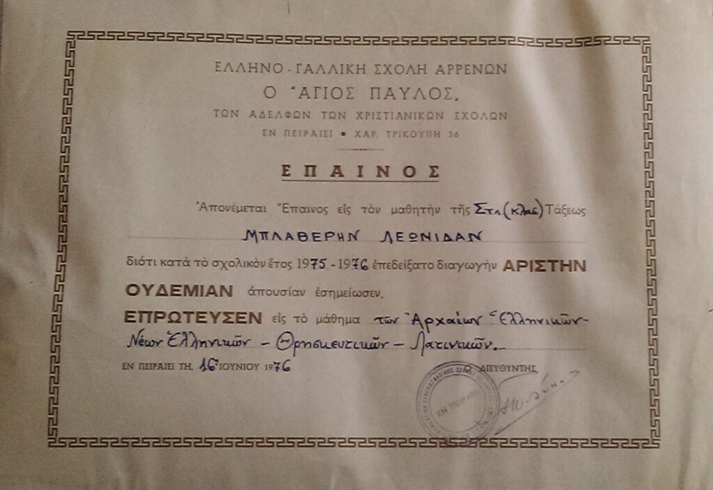 To 1970 που μπήκα εγώ στη Γαλλική ήταν στη μέση της δικτατορίας. Το Σχολείο ήταν αμιγώς σχολείο αρρένων, έχοντας αποκλειστικά άντρες καθηγητές και πολλούς frères (νομίζω 6-7). Νομίζω ήταν ιδανικός ο αριθμός των frères προκειμένου να μεταλαμπαδευτεί το πνεύμα του Δελασάλ που σημαίνει πειθαρχία, προσοχή και προσήλωση στα μαθήματα και με στόχο, πρώτιστα τη δημιουργία ενός καλού ανθρώπου και έπειτα ενός καλού μαθητή. Αυτή είναι η δική μου εντύπωση αλλά μπορώ να το αιτιολογήσω. Στο τέλος κάθε χρονιάς, η Σχολή έδινε ένα βραβείο με τρία κριτήρια. Πρόκειται για τον λεγόμενο «Χρυσό Έπαινο», από το χρυσό μαίανδρο που τον περιέβαλε,  όπου έπρεπε α) να έχεις πρωτεύσει τουλάχιστον σε ένα μάθημα, β) να έχεις άριστη διαγωγή και γ) να μην έχεις σημειώσει καμία απουσία.