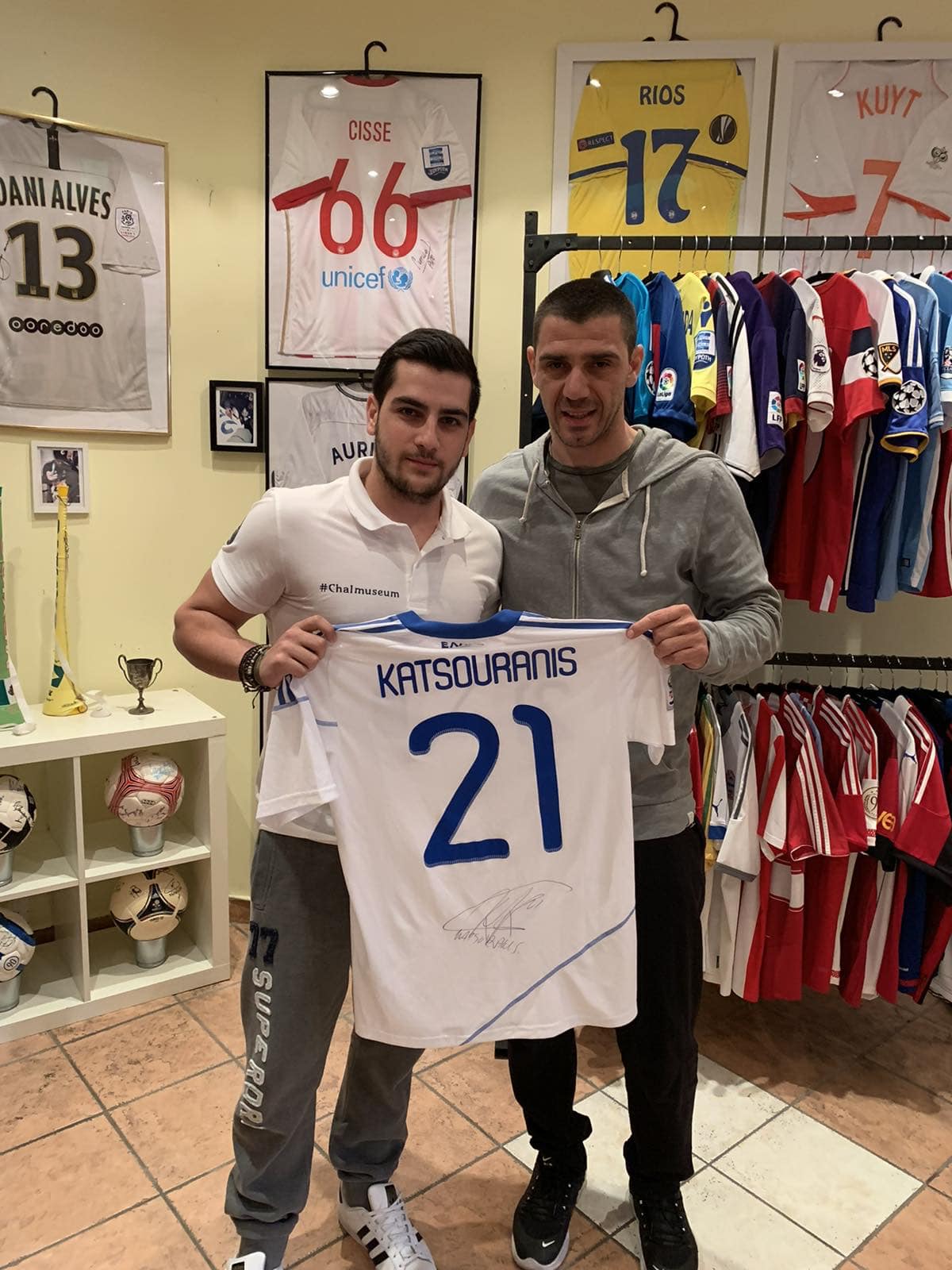 Μετά τη φανέλα του Xavi, θα δώσω ως δεύτερη φανέλα που είμαι συναισθηματικά δεμένος μαζί της αυτή του Κατσουράνη. Θέλω εδώ να πω κάτι. Ο Κατσουράνης ήταν ο πρώτος άνθρωπος που αυτοπροσώπως ήρθε στο μουσείο ως μεγάλος αθλητής. Τότε, φανταστείτε ότι ήταν συλλογή δεν ήταν καν μουσείο. Η φανέλα του λοιπόν είναι φορεμένη όταν αγωνιζόταν στην Εθνική Ελλάδος και πιο συγκεκριμένα στο Mundial του 2010 στη Νότιο Αφρική και είναι μάλιστα από την πρώτη νίκη της Εθνικής σε Παγκόσμιο Κύπελλο. Ήταν απέναντι στην ομάδα της Νιγηρίας. Είχα πει λοιπόν στον Κατσουράνη ότι θέλω απλά μια φανέλα του και μια επίσκεψη στο χώρο να μου πει αν του αρέσει. Ήρθε στο μουσείο και μου έδωσε αυτήν τη φανέλα. Τον ρώτησα αν είναι σίγουρος διότι μιλάμε για ιστορικό αγώνα της Εθνικής. Μου απάντησε ότι του άρεσε τόσο πολύ η προσέγγισή μου και αυτό που κάνω που ειλικρινά ήθελε να μου δώσει ότι καλύτερο μπορούσε. Ακόμα μιλάμε με τον Κατσουράνη και περί δημοσιογραφίας αλλά και για το μουσείο. Είναι πολύ ξεχωριστός άνθρωπος. Πολλοί, όταν έπαιζε ποδόσφαιρο, έλεγαν για το χαρακτήρα του. Είναι ένας άνθρωπος ο οποίος έχει βοηθήσει το μουσείο και εμένα προσωπικά όχι τόσο για να βρω φανέλες αλλά σε επίπεδο συμβουλών και στήριξης στο μουσείο. Χωρίς να ξέρει που θα φτάσει όλο αυτό το εγχείρημα.